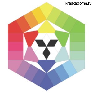 Особой гармоничностью обладают цвета, которые находятся на противоположных сторонах. Между этими парами родственно-контрастных цветов существует двойная связь: у них равное количество объединяющего цвета и равное количество контрастного цвета.